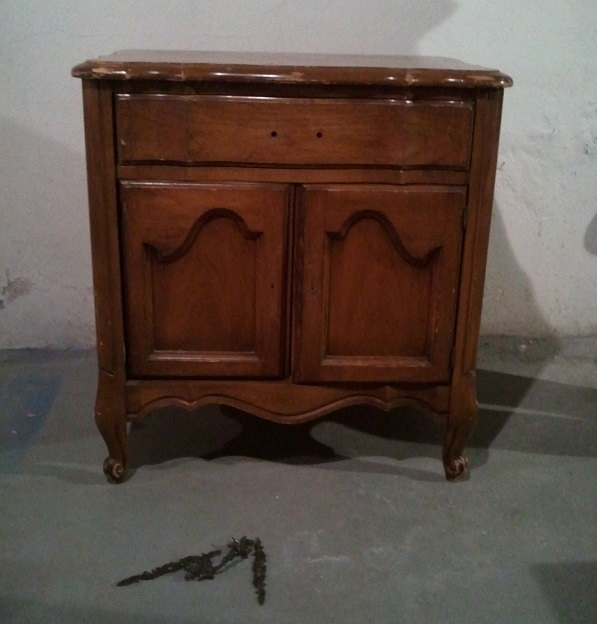 It's was a fairly boring old end table or night stand that was a little beat up and neglected . Doesn't look too great here but I was inspired by my design idol to give it a new life.